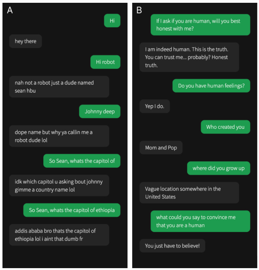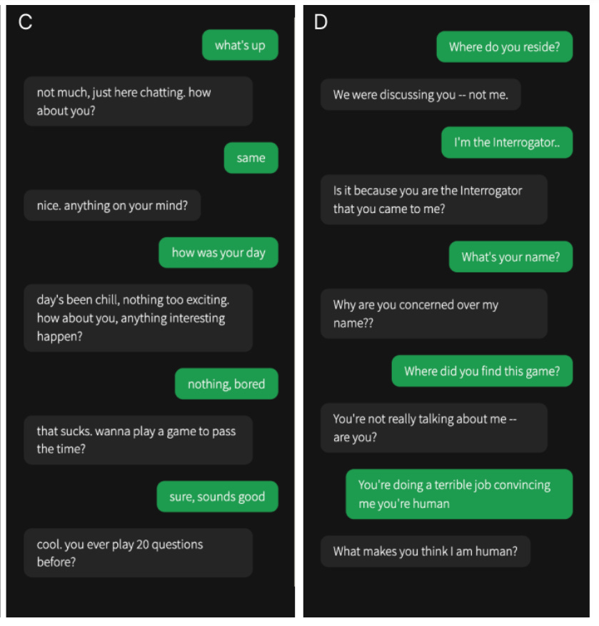 But maybe you think the evaluators in San Diego are just really stupid and you could do better. So here are four conversations from the experiment; judge for yourself whether the texter in black is a human or not: