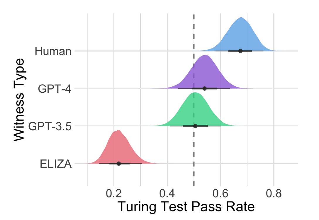 GPT-3.5 was able to pass the test 50% of the time, while GPT-4 was able to pass 54% of the time. The more rudimentary chatbot ELIZA was only able to pass 22% of the time. This proves that, a majority of the time, advanced chatbots are now capable of successfully imitating human beings. (Another interesting feature of the results is that evaluators were only able to correctly recognize other humans 67% of the time. Maybe it lends some credence to the whole NPC meme that a third of people are literally indistinguishable from robots.)